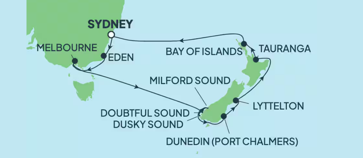 Set sail from Sydney on an unforgettable journey across the Tasman Sea to New Zealand’s spectacular landscapes. Cruise through dramatic fjords, explore vibrant cities and discover charming coastal towns across both Australia and New Zealand. From Melbourne’s cultural energy to the breathtaking beauty of Fiordland National Park and the Bay of Islands, this itinerary combines natural wonders, wildlife and iconic destinations in one seamless cruise experience.