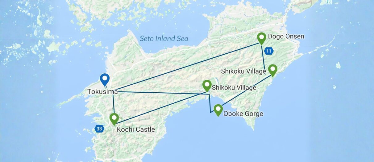 Tokushima  Kochi Castle and Matsuyama Castle  Dogo Onsen  Oboke Gorge  Shikoku Village  Mt. Bizan in Tokushima