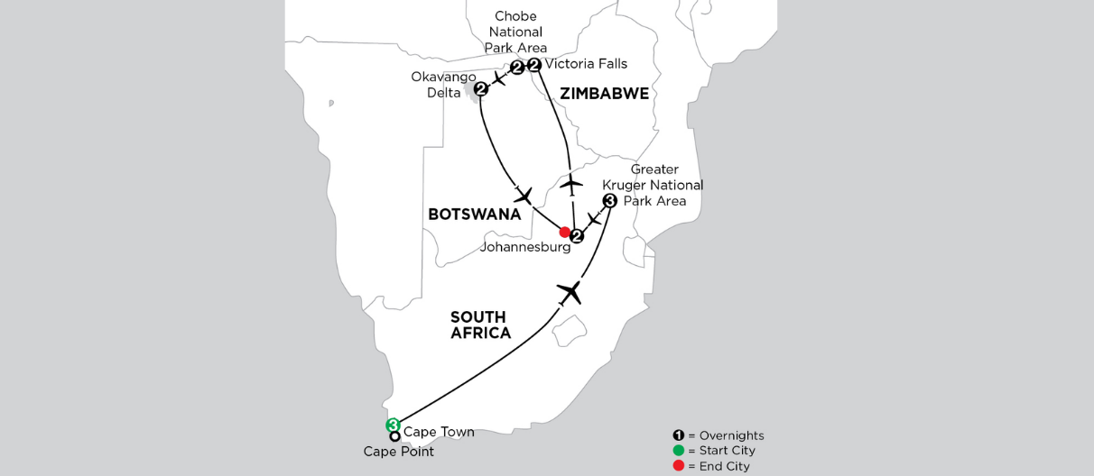 Fitness Level: Suitable for most travellers. Game drives require minimal physical effort, while some walking is involved at locations such as Victoria Falls and Cape Town. Activities can be adjusted to suit your comfort.